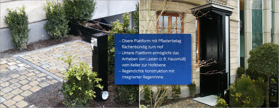 Diese Hebebühne wurde konzipiert, um mit einer teleskopierbaren Führung und Hubanlage in optisch gelungener Art und Weise den im Keller liegenden Hauswirtschafts- und Müllraum mit dem Straßenniveau zu verbinden. Somit ist das wöchentliche Hinausstellen der Mülltonnen über unsere Hubbühne im privaten Bereich zu erledigen.