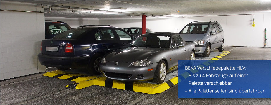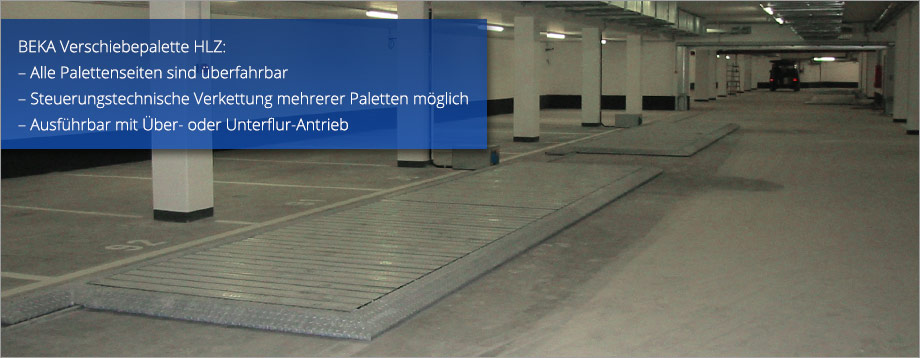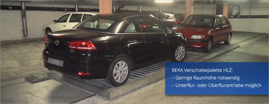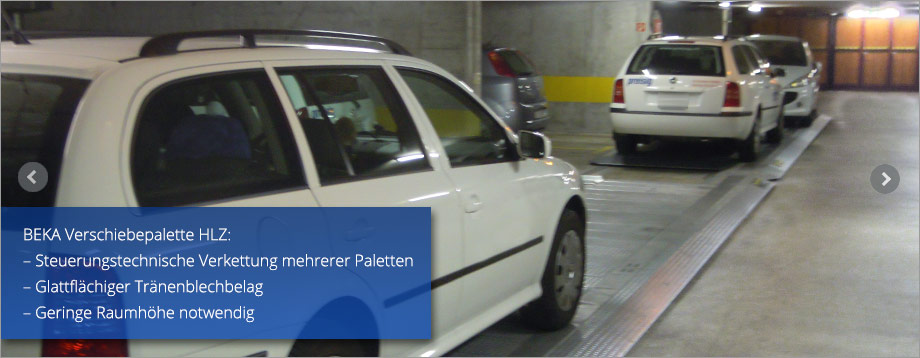 – steuerungstechnische Verkettung mehrerer Paletten, die sich eine Führungsschiene teilen - Palettengrößen für ein (HLE) oder zwei Autos (HLZ) hintereinander, zwei Autos (HLZP) nebeneinander oder vier Autos (HLV) im Quadrat angeordnet.